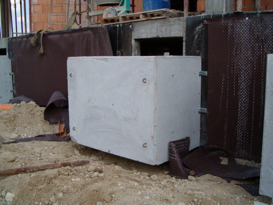 A questo punto le funi di sollevamento si possono allentare e i golfari possono essere tolti per posare la griglia. La bocca di lupo è cosi posata a regola d’arte, buona norma è comunque impermeabilizzare la struttura prima di interrare. In figura 1 si possono vedere due barre in acciaio fissate nel muro: una pratica spesso utilizzata per posizlonare velocemente e correttamente i prefabbricati alla quota corretta, non hanno alcuna funzione statica, unica accortezza è ripristinare poi l’impermeabilizzazione.